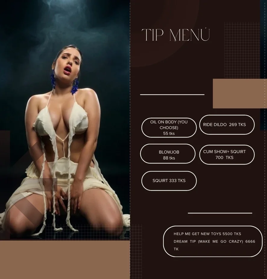 Dança erótica, Cuckold, Dildo ou vibrador, Chuveiro, Fetiche por pés, Exibicionismo, Masturbação, Nylon, Show com óleo, Rebolando, De quatro, Ahegao, Capô de fusca, Penetração com dedos, Linguagem explícita, Striptease, Boquete, Masturbação com os pés, Posição 69, Topless, Espiadinha por baixo, Avaliação de pintos, Brinquedos para mamilos, Gagging, Ao ar livre, Tapas, Gozada, Gozando dentro, Garganta profunda, Humilhação, Mandar bater uma, Atuação, Brinquedos sexuais, Peitinhos, Orgasmo, Punheta, Ejaculação feminina, Salto alto, Cavalgada